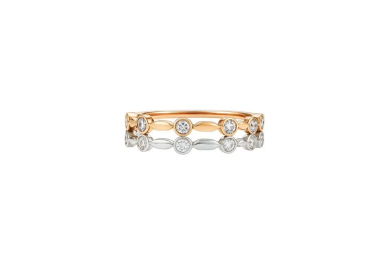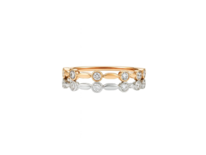 La bague Célia II se décline en deux versions distinctes : l’une en or rose, l’autre en or blanc. Chaque anneau est rythmé par une alternance de diamants sertis clos et de maillons délicatement dessinés, créant une allure chic et harmonieuse. Portées seules ou en duo, elles composent une silhouette moderne et lumineuse.