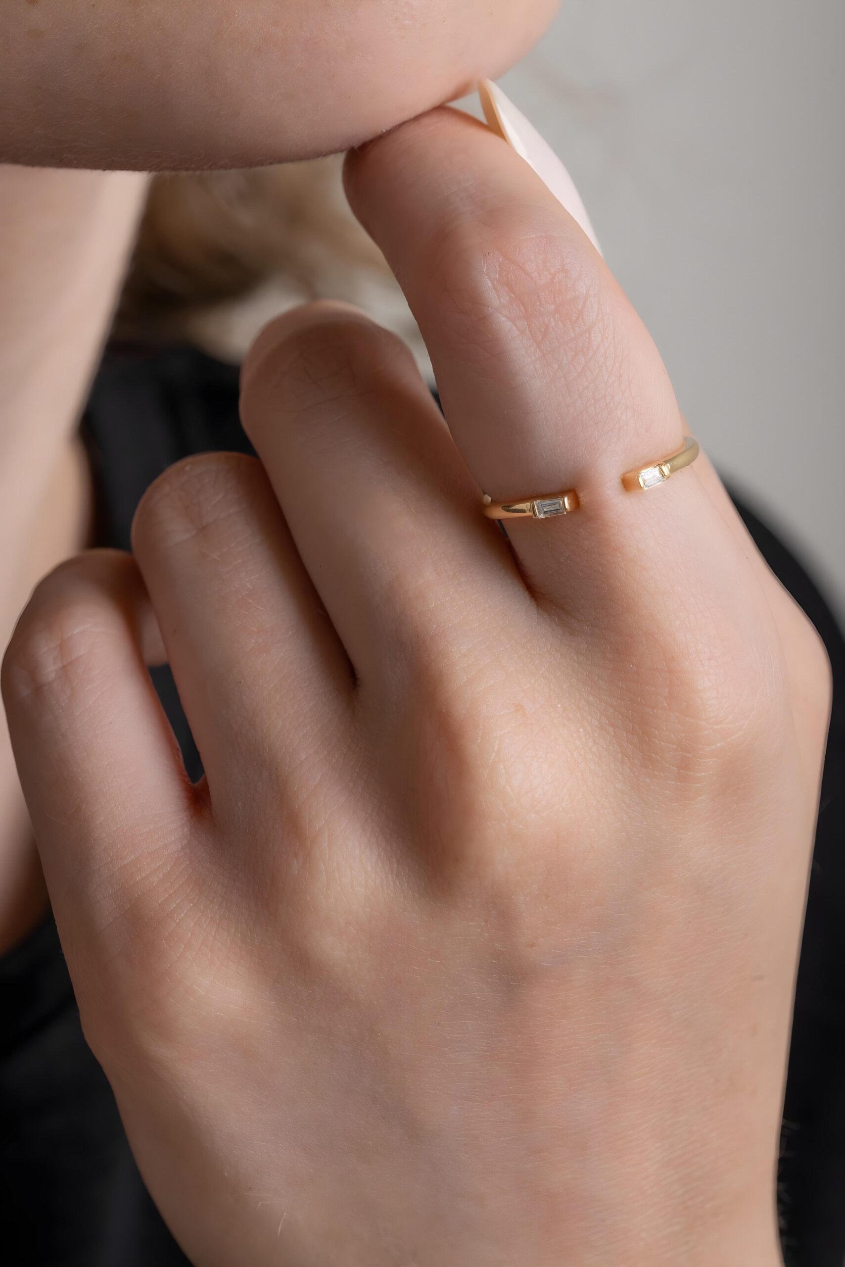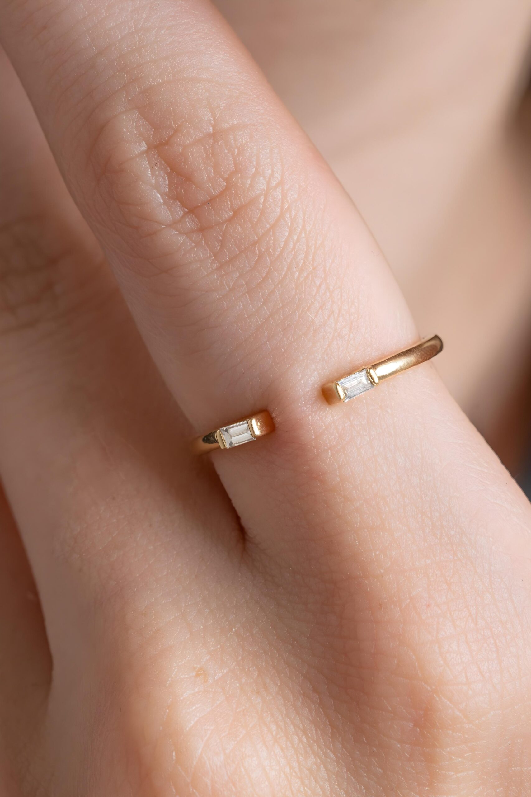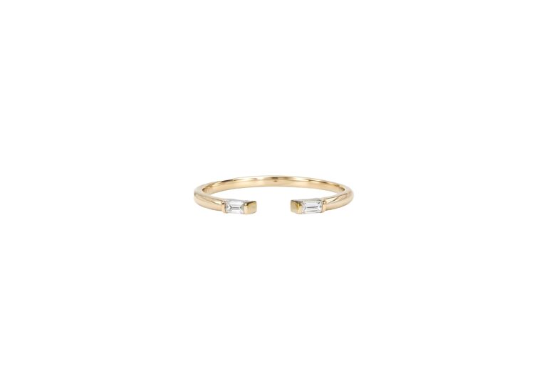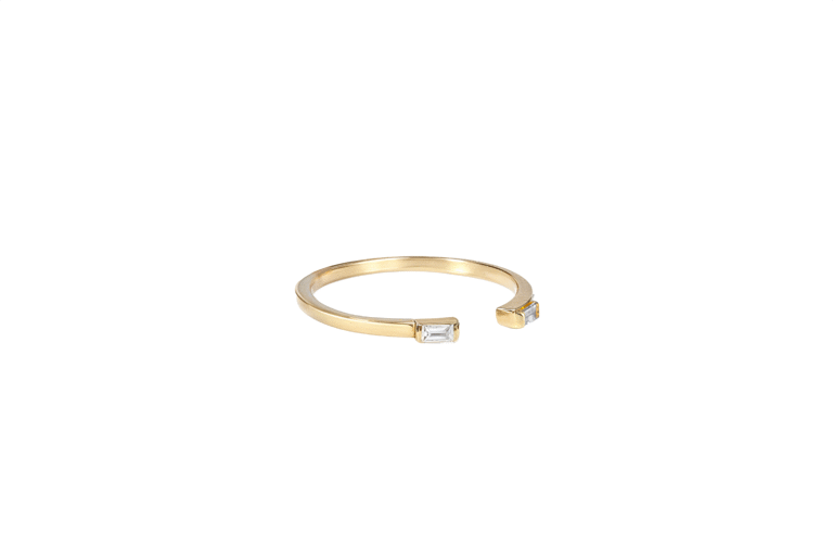 Une bague ouverte, ornée de deux diamants baguette qui se font face avec précision. Minimaliste et affirmée, elle joue sur la symétrie et la lumière pour un style chic et contemporain.