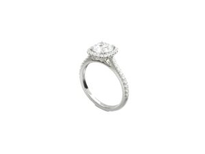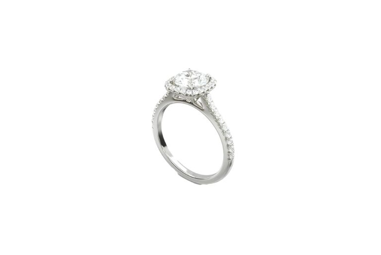 Son halo délicat encadre le diamant central d’une couronne de lumière, amplifiant chaque reflet avec une intensité captivante.