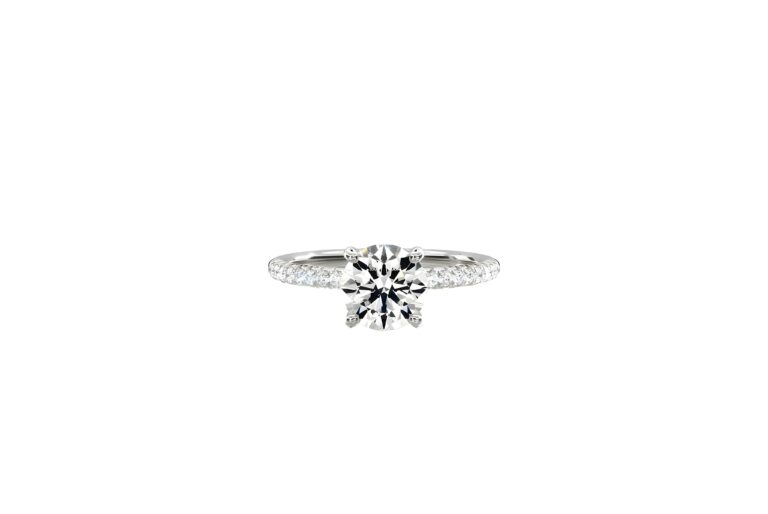 Son halo délicat encadre le diamant central d’une couronne de lumière, amplifiant chaque reflet avec une intensité captivante.