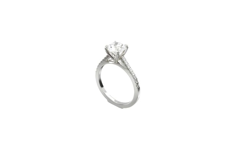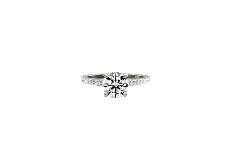 Ce solitaire pavé sublime l’éclat du diamant central grâce à une monture délicatement sertie de pierres fines, qui prolongent la lumière le long de l’anneau.