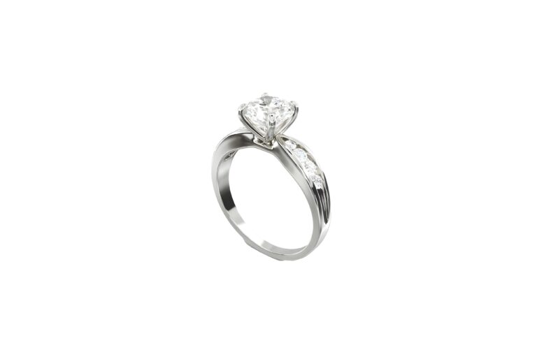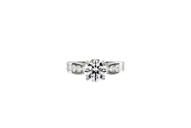 Ses lignes fendues se rejoignent sous le diamant, créant un mouvement fluide qui met en valeur la pierre centrale avec une élégance naturelle.